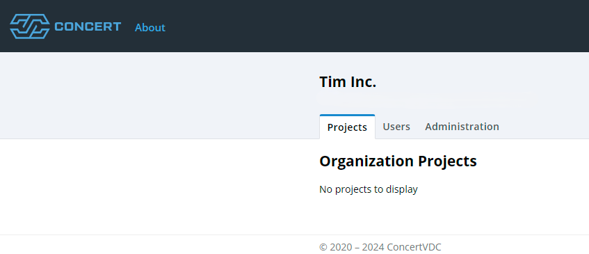 On your CONCERT homepage, your new Organization is now visible. Click on your Organization to add your company logo or identity mark to the homepage for your company’s projects. This will take you to the Organization homepage, where all your projects will be displayed. Initially, it will look something like this.