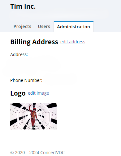 Select the “Administration” Tab. You will find a place to upload your company’s logo or identity mark here. Click on the blue “Add Image” above the logo square to select the image to include. Images with a resolution of at least 300 DPI and a square format work best. We suggest you edit the image you want to use before adding it to CONCERT, since this function has no edit tools.